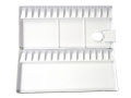 水彩やデザイン用の絵具は油絵具と比べやわらかく、しかも水でうすめて使用する時がおおいので、パレットは色別の仕切りや混色皿の仕切りがついたものが便利です。